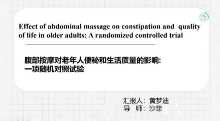 黄梦迪同学分享的文献为《腹部按摩对老年人便秘和生活质量的影响:一项随机对照试验》,文献以便秘是老年人重要的健康问题为背景进行研究,指出了腹部按摩对解决老年人便秘问题是有效的,并能最大限度的减少或消除便秘问题,提高老年人的生活质量。