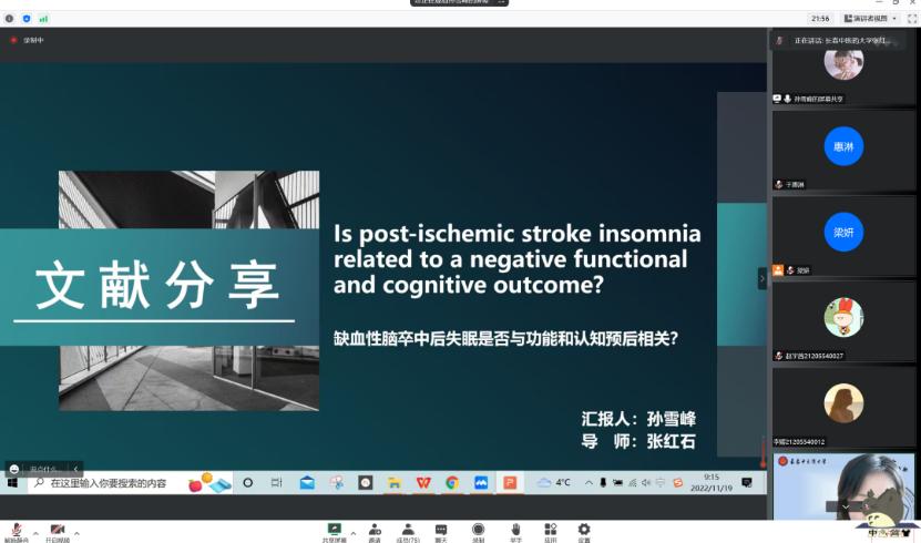 孙雪峰同学分享的文献为《Is post-ischemic stroke insomnia related to a negative functional and cognitive outcome?》,文章通过对157例缺血性卒中患者在葡萄牙卒中病房住院期间进行回顾性评估,确定缺血性脑卒中后失眠患者的特征以及缺血性脑卒中和失眠患者与非缺血性脑卒中和失眠患者在认知和功能结果方面的潜在差异,比较前循环卒中和后循环卒中患者急性血管事件后获得性失眠的情况,得出中风和睡眠可能存在双向联系,脑卒中后急性和恢复期的睡眠时间与认知功能之间存在相关性的结论。