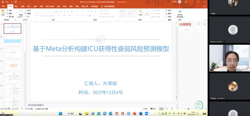 为进一步推进研究生学术交流,提高研究生科研水平,激发同学们对科研的热情,提高同学们的学术修养,beat365中国官网于2022年12月4日18:30在腾讯会议行了线上学术文献分享活动。本次活动由王洋老师任指导教师,2021级护理研究生方海丽(专硕),202护理研究生郭士琪(学硕)向大家进行文献汇报,2021级、2022级全体研究生参加此次讲座。