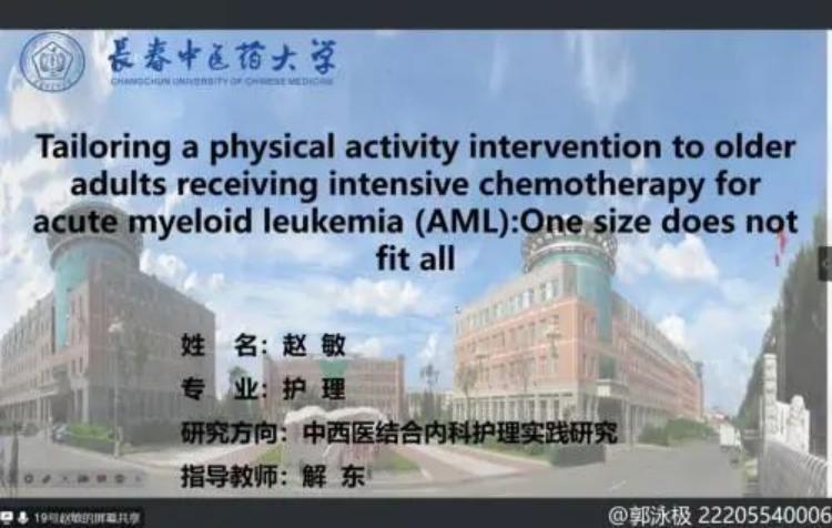 赵敏同学分享的文献为《Tailoring a physical activity intervention to older adults receiving intensive chemotherapy for acute myeloid leukemia (AML):One size does not fit all》,文章节选自外文期刊《Journal of Geriatric Oncology》,研究者为验证老年急性髓系白血病强化期治疗的体育活动干预方式,针对接受强化治疗的老年人的体育活动干预是否可以用于有疾病和治疗相关症状的住院患者研究领域,对符合纳排标准的AML患者展开研究,得出针对罹患该种疾病的老年人的体育运动锻炼要进行个体化的原则,为后续开展运动干预治疗提供理论指导。