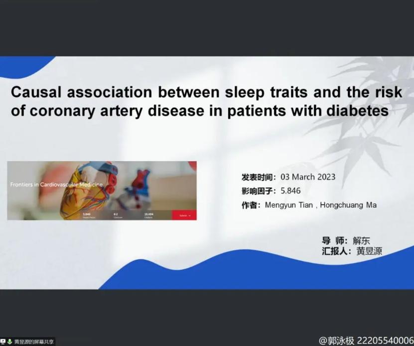 黄昱源同学分享的文献为《Causal association between sleep traits and the risk of coronary artery disease in patients with diabetes》,研究者为评估糖尿病患者的睡眠特征和冠心病之间的因果关系。从相应的全基因组关联研究(GWAS)中提取与五种睡眠相关特征(失眠、睡眠时间、容易起床、早晨起床和打鼾)相关的遗传工具变量。基因变异与CAD之间的关联是基于15666名糖尿病患者(3968例冠心病病例和11696例对照组)。主要分析采用逆方差加权法进行。以确认主要结果的稳健性和一致性。结果显示糖尿病患者患失眠症的遗传倾向与冠心病风险的增加显著相关[优势;95%CI:1.072–1.254;p = 0.001]。发现了两种睡眠时间之间的暗示证据(OR:0.629)。证实了糖尿病患者对的睡眠特征与冠心病之间的因果关系。