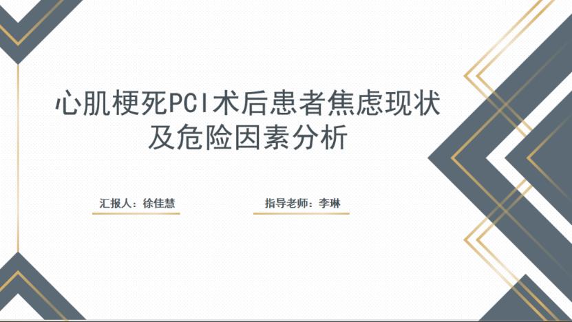 徐佳慧同学分享的文献为《心肌梗死PCI术后患者焦虑现状及危险因素分析》,目的了解心肌梗死行经皮冠状动脉介入治疗(PCI)术后患者焦虑现状,并分析其危险因素。方法采用便利抽样方法,选取医院收治的149例心肌梗死PCI术后患者为研究对象,采用汉密尔顿焦虑量表(HAMA)对其进行调查,根据得分将患者分为焦虑组和非焦虑组。采用二项Logistic回归分析探讨心肌梗死PCI术后患者焦虑的危险因素。回归分析结果显示,女性、居住地为农村、合并高血压、双支及以上血管病变、射血分数≤50%、付费方式为自费/新农合是心肌梗死PCI术后患者发生焦虑的独立危险因素(P<0.05)。结论为心肌梗死PCI术后患者发生焦虑的主要危险因素包括女性、居住地为农村、合并高血压、双支及以上血管病变、射血分数≤50%、付费方式为自费/新农合。因此,临床护理人员应重点关注高危人群,采取针对性干预措施,以降低心肌梗死PCI术后患者焦虑的发生风险。