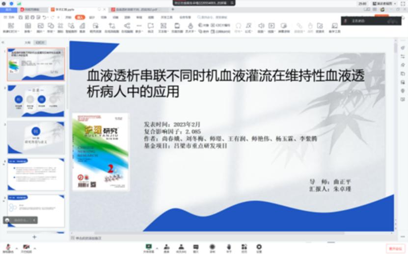 朱卓谨同学做了关于《血液透析串联不同时机血液灌注在维持性血液透析病人中的应用》的文献分享。文章采用自身交叉对照研究方法,选取合并高磷血症、高β2微球蛋白、继发性甲状旁腺功能亢进以及皮肤瘙痒的血液透析病人30例,分别接受2次血液透析(4h)串联不同时机(前2h/后2h)血液灌流治疗,比较两次治疗前后病人血肌酐、血尿素氮、全段甲状旁腺激素、β2‐微球蛋白、血磷等生化指标以及主观皮肤瘙痒程度得分,得出血液透析串联后2h血液灌流有助于提高血液透析充分性、病人主观舒适度,提高临床护理工作效率的结论。
