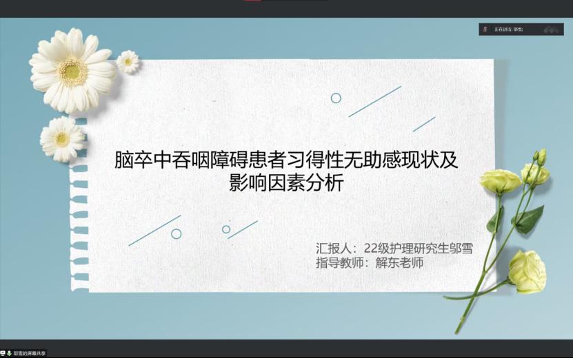 邬雪同学分享的文献为《脑卒中吞咽障碍患者习得性无助感现状及影响因素分析》,文章选取236例接受康复治疗的脑卒中吞咽障碍患者为研究对象,采用一般资料调查表、习得性无助感量表、脑卒中自我效能感问卷、领悟社会支持量表、心理一致感量表进行调查,用以了解脑卒中吞咽障碍患者习得性无助感现状,并分析影响因素,为制订针对性干预措施提供参考。得出脑卒中吞咽障碍患者存在较严重的习得性无助感,医护人员可通过提高患者社会支持水平、增强自我效能感与心理一致感,从而降低其习得性无助感的结论。