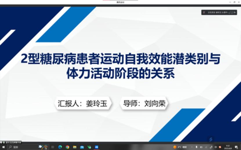 姜玲玉同学做了关于《2型糖尿病患者运动自我效能潜类别与体力活动阶段的关系》的文献分享,文章采用一般资料调查表、运动自我效能量表、国际体力活动问卷和体力活动阶段算法对315例2型糖尿病患者进行调查。采用潜在剖面分析对运动自我效能进行特征分类,通过有序logistic回归分析体力活动行为阶段的影响因素。得出运动自我效能是体力活动行为阶段的重要预测因子,应根据患者自我效能类别给予针对性干预的结论。
