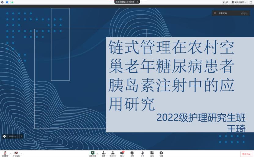 王琦同学分享的文献为《链式管理在农村空巢老年糖尿病患者胰岛素注射中的应用研究》,文章以村为单位实施整群随机抽样法,选取2021年1月—12月共96例在县域联盟单位接受胰岛素治疗的老年糖尿病患者进行对照实验,试验组接受链式管理,对照组接受常规管理。比较干预前及干预后3、6个月两组的胰岛素注射 管理能力、血糖代谢指标、生存质量及胰岛素注射并发症发生率。得出实施链式管理能提升农村空巢老年糖尿病患者的胰岛素注射管理能力,有助于控制血糖,改善患者的生存质量,提高注射的安全性的结论。