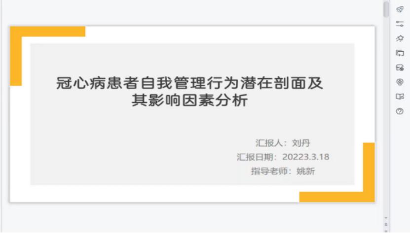 刘丹同学分享的文献为《冠心病患者自我管理行为潜在剖面及其影响因素分析》,文章选自于《现代预防医学》。本研究旨在探索冠心病患者自我健康管理行为类型及其影响因素,采用便利抽样的方法于某三级甲等医院心内科750 名患者进行调查,结果显示年龄较大和心功能级别较差是自我管理行为的危险因素,有配偶、受教育时间较长、家庭月收入较高、PSK - CHD 得分较高和 CHBMS 得分较高是自我管理行为的保护因素。该研究为医务人员制定针对性的临床干预措施提供依据。