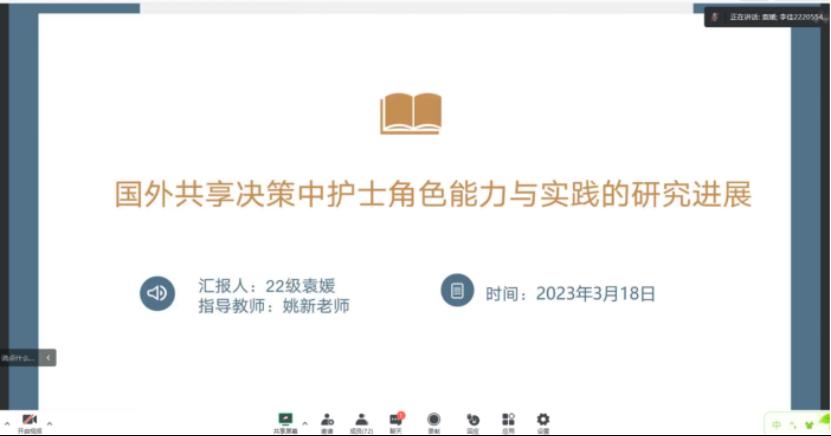 为进一步提升研究生学术研究水平,激发学术灵感,营造开放融合的学术交流氛围,beat365中国官网于2023年3月18日9:00在腾讯会议连续举行线上学术文献分享活动。此次活动由姚新老师担任指导教师,2021级护理研究生刘丹、2022级护理研究生袁媛进行文献分享,2021级、2022级全体研究生参加。