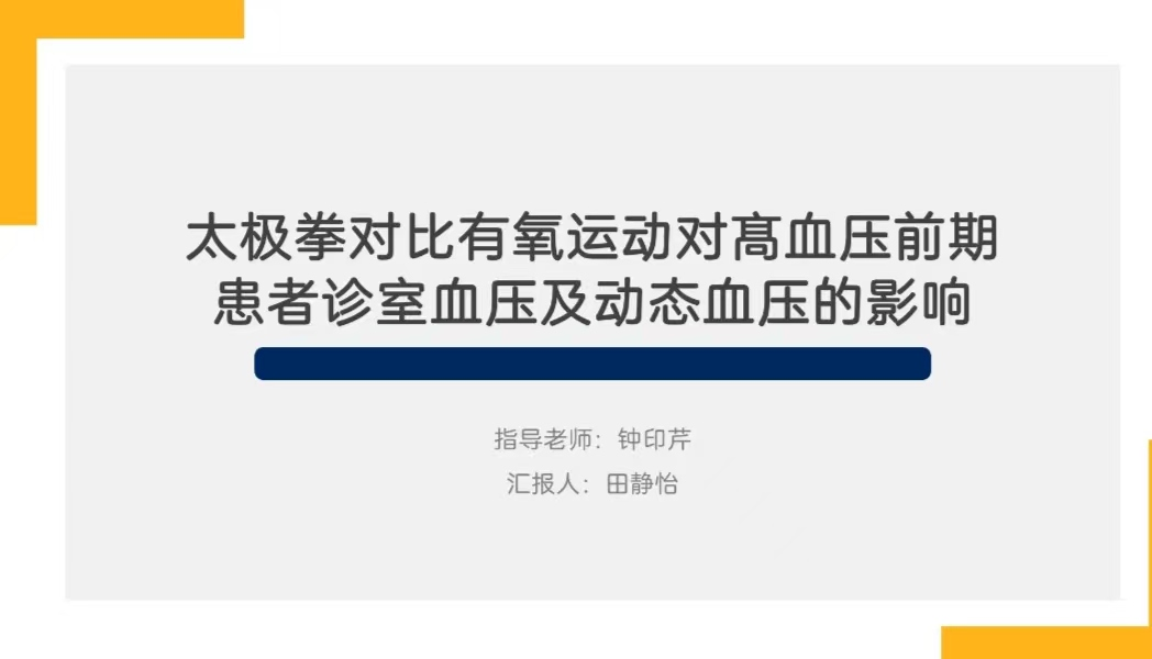 田静怡同学分享的文献为《太极拳对比有氧运动对髙血压前期患 者诊室血压及动态血压的影响》,本文探究太极拳对比有氧运动对高血压前期患者诊室血压、24小时动态血压(ABPM)的影响,为高血压前期人群的健康管理提供科学参考。文章详述髙血压前期的中西医临床研究进展及非药物疗法在髙血压防治领域的研究进展,为太极拳可能可 以作为高血压前期人群的一种能够显著降压的干预方式,有望成为有氧运动的可行替代运动治疗方式提供依据。着重从研究内容、试验方案、研究结果、讨论四个方面展开阐述,研究结果表明太极拳运动能有效降低高血压前期患者的诊室血压及24小时动态血压,提高生活质量,疗效显著优于有氧运动,且经济、安全、依从性高,值得临床推广。