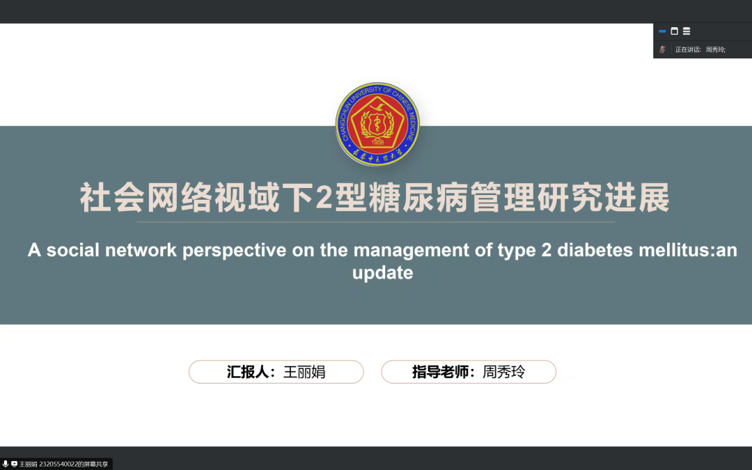 王丽娟同学分享的文献为《社会网络视域下2型糖尿病管理研究进展》,本文从糖尿病管理理论框架、社会网络特征及其主要评估工具、社会网络视域下的糖尿病管理等方面进行综述,为有效管理2型糖尿病提供参考。从研究背景、社会网络的基本内容、社会网络视域下的糖尿病管理、总结与启发等方面阐述2型糖尿病管理的研究进展。目前相关研究仍处于起步阶段,亟需统一社会网络的测量方法并收集更广泛的高质量数据。