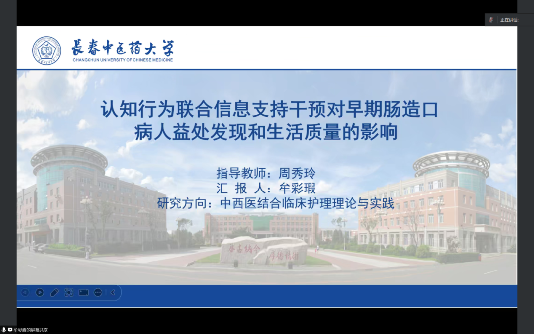 牟彩瑕同学分享的文献为《认知行为联合信息支持干预对早期肠造口病人益处发现和生活质量的影响》,本文主要探讨认知行为联合信息支持干预对早期肠造口病人益处发现和生活质量的影响,采取常规护理基础上给予认知行为联合信息支持干预,测量患者生活质量核心量表躯体功能、角色功能、认知功能、情绪功能、社会功能和整体健康状况。从研究背景、研究设计及方法、研究结果和研究结论四个方面阐述认,结论是认知行为联合信息支持干预可以提高早期肠造口病人的益处发现水平,有效改善其生活质量。