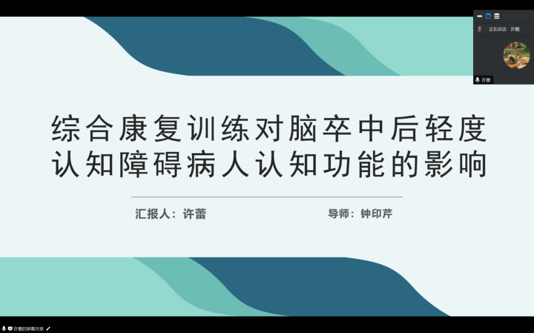 许蕾同学分享的文献为《综合康复训练对脑卒中后轻度认知障碍病人认知功能的影响》。脑卒中后认知功能障碍的治疗方案多为药物治疗,但效果不佳,不能充分的改善病人的临床症状,而科学的康复护理可以使脑卒中后认知功能障碍得到改善。本文观察综合康复训练在脑卒中轻度认知障碍病人中的应用效果。从研究背景、研究对象与方法、研究结果、讨论等方面阐述综合康复训练对脑卒中后轻度认知障碍病人认知功能的影响。结论是基于综合康复训练的护理干预在脑卒中后轻度认知障碍病人中的应用效果较好,改善了病人的认知功能、负性情绪及日常生活能力。