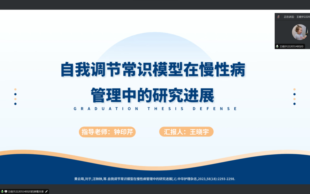王晓宇同学分享的文献为《自我调节常识模型在慢性病管理中的研究进展》,自我调节常识模型描述了患者通过自我调节加强理解和管理疾病的过程,为分析疾病表征、应对与健康结局的关系提供了理论框架。从自我调节常识模型的产生与发展、框架、临床应用与启示四个方面介绍自我调节常识模型在慢性病管理中的研究进展。结论是CSM是实现主动管理疾病的可用模型,帮助患者理解自身的健康问题,对患者如何适应和应对疾病具有重要的意义。但目前我国起步较晚,因此需要对CSM进一步开展本土化干预研究,以期更有效的指导患者管理疾病。