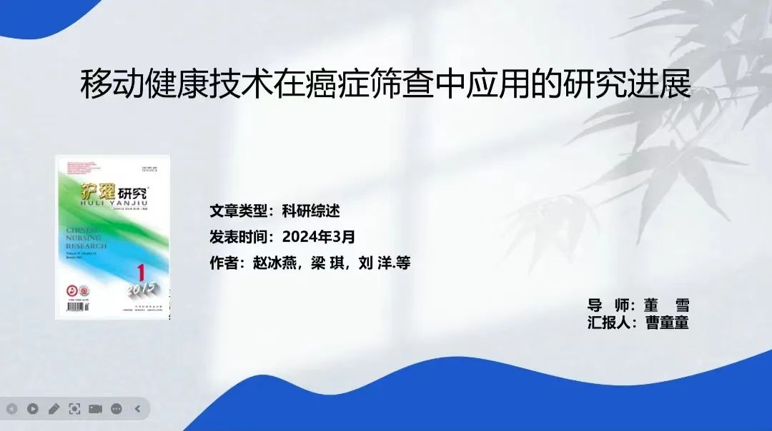 曹童童同学分享的文献为《移动健康技术在癌症筛查中应用的研究进展》,本文主要从癌症筛查教育、癌症筛查辅助决策、癌症风险评估、诊断性筛查工具的转化应用、癌症筛查数据收集和癌症筛查后追踪进行概述,旨在为我国今后开发移动应用程序、发展移动健康在癌症筛查服务中的应用提供参考。重点阐述了移动健康技术在癌症筛查中的应用,主要包括癌症风险评估、诊断性筛查工具的转化应用等,并指出移动健康技术在癌症筛查领域中应用存在的不足,同时明确移动健康在我国癌症筛查领域中的发展与应用尚处于初始阶段,建议未来开展更多大样本、多中心的干预试验来验证移动健康技术的应用效果,并借鉴国外成功的经验,开发相应的癌症筛查移动健康服务平台,为临床提供实践依据,推动癌症事业的发展。