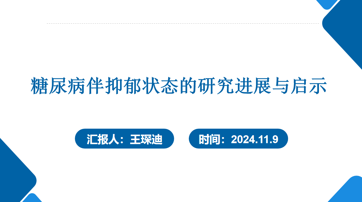 王琛迪同学分享的题目是《糖尿病伴抑郁状态的研究进展与启示》,主要介绍了糖尿病伴抑郁状态的流行病学、机制及影响因素、护理干预、总结与启示等方面内容。糖尿病是内分泌代谢疾病,发生机制复杂,涉及海马体区、HPA 轴、5 - 羟色胺及神经营养因子等方面功能异常,同时受人口学、遗传学和社会心理等多种因素影响。针对糖尿病伴抑郁状态有多种护理干预方式,如药物治疗、认知行为疗法、运动疗法等。未来需深入研究发病机制、借助科技手段来探讨糖尿病的干预方案。