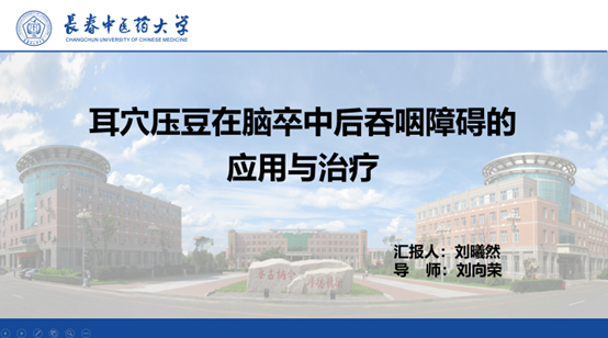 刘曦然同学分享的题目是《耳穴压豆在脑卒中后吞咽障碍的应用与治疗》,主要介绍了耳穴压豆技术在脑卒中后吞咽障碍治疗中的作用及其联合其他外治法的应用。脑卒中后吞咽障碍是一种常见后遗症,表现为吞咽困难、饮水呛咳等。耳穴压豆以中医理论为基础,通过刺激耳部特定穴位,调节经络气血和脏腑功能,改善吞咽障碍,从现代医学看,其机制包括引发神经反射,调节中枢与周围神经功能,促进吞咽肌肉协调。耳穴压豆核心作用体现在疏通经络、调和气血、改善脏腑功能、缓解疼痛与情志、提升睡眠质量等方面。通过与物理疗法、康复训练等外治法结合,该技术显著提升吞咽功能障碍的康复效率,并在语言障碍、认知障碍等领域展现潜力。未来耳穴压豆技术将向精准化、综合化方向发展,结合现代科技手段,为脑卒中后遗症的康复提供更优质、高效的解决方案。