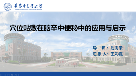 王彩霞同学分享的题目是《穴位贴敷在脑卒中便秘中的应用与启示》,主要探讨了这一传统疗法在脑卒中后便秘治疗中的独特优势与创新实践。脑卒中后便秘是一种常见并发症,严重影响患者生活质量,穴位贴敷结合药物和穴位刺激,因其显著的疗效受到广泛关注。其用药特点以泄热通腑、理气通便、活血化瘀为主,并灵活配伍补气养阴等方案,常用膏剂具有操作简便、安全可靠的优势。穴位贴敷与按摩、耳穴压籽、针刺等外治法联合应用,显著提升了整体治疗效果,优化了临床方案。穴位贴敷凭借高效、安全的特点,有望随着中医现代化进程的推进进一步推广,成为脑卒中后便秘的可靠治疗方法,为更多患者带来福音。