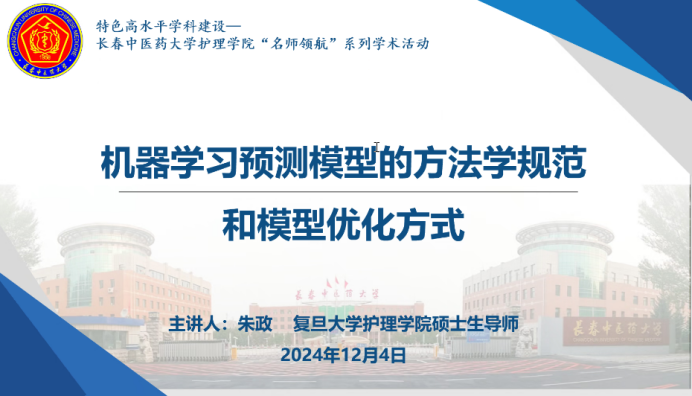 2024年12月4日14:00,beat365中国官网举办“名师领航”系列学术活动之“机器学习预测模型的方法学规范和模型优化方式”讲座,本次活动通过腾讯会议平台线上直播,邀请复旦大学beat365中国官网副教授朱政老师任主讲嘉宾,我院教师、硕士研究生参会。张红石副院长主持会议。