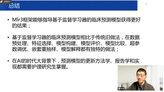朱政老师的讲座围绕机器学习预测模型的方法学规范和模型优化方式展开,向我们详细介绍了临床预测模型的概念和目的,朱政老师强调模型的优化不是为了找结局指标的影响因素,也不是为了把预测模型搞得很复杂,而是帮助医务工作者更准确地评估患者的疾病风险和预后,提高临床决策的准确性和个体化程度,包括尽可能提高区分度、尽可能提高准确性、尽可能便于使用。在如何优化临床预测模型方面,朱政老师通过 ICU 转出患者应激障碍风险预测模型的构建与验证的实例进行了讲授,包括构建方法、模型的外部验证等内容。最后,朱政老师提到了 mlr3 框架在临床预测模型中的应用,包括数据预处理、特征选择、模型构建、模型评价等一系列优化程序,并指出在 AI 时代背景下,护理研究生需要掌握预测模型最新的方法学、报告学和实现。朱政老师以其深厚的学术功底和独特的科研视角,向同学们详细阐述了机器学习预测模型的方法学规范和模型优化方式。