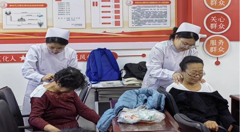 本次活动中,服务团成员为居民实施了量血压、刮痧、推拿等基础护理保健服务。同时为进一步传播健康理念,提高居民健康意识,服务团成员为社区居民进行健康宣讲以及发放秋冬季养生知识宣传单与中医药文化科普宣传册。对于居民提出的问题,服务团成员给予细致的解答,受到社区居民一致好评。