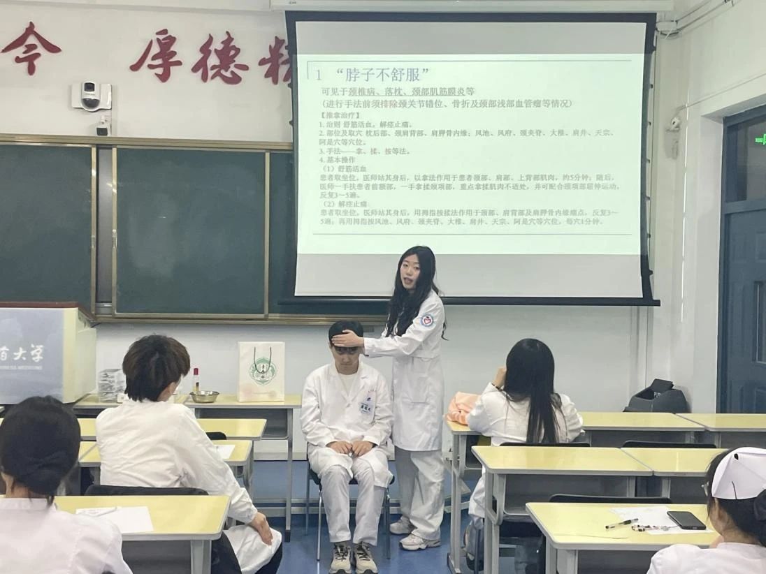 本次培训主要包括四部分内容,分别是中医穴位辨识、基础按摩推拿示教、血压测量和刮痧。薛志龙同学讲解如百会穴、阿是穴等中医常用保健穴位的定位方法及主治功效,及一种家庭保健揉腹手法。曲子涵同学现场详细演示并讲解基础按摩推拿的操作手法。胡双同学围绕刮痧的部位、力度和手法进行了重点讲解,同时还介绍了血压计的使用方法及相关注意事项。主讲团队在学员们分组实操模拟时针对学员们在操作过程的难点和易错点进行纠正,确保正确掌握培训内容。