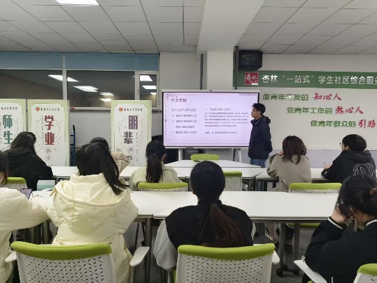 交流分享中,尹维民同学结合实际经历从论文选题、文献阅读、构思与提纲、正文写作、修改与润色等五部分展开叙述论文写作经验。首先,主讲人对选题方向的确定方法进行了全方位的分析,在论文写作过程中,最开始的选题就像是一盏明灯,决定了整篇论文的方向。其次,主讲人强调要有扎实的文献积累。完成文献阅读后进行构思与提纲的制定是十分必要的,从而确保在实际写作时思路清晰,不偏离主题。最后,主讲人提出撰写论文时间安排要合理,积极调动主观能动性。交流互动环节,同学们积极提问,现场气氛热烈。此次分享增强了同学们完成毕业论文的信心和动力,大家都表示受益匪浅。