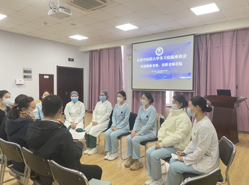 此次检查内容包括学生的出勤情况、着装、实习手册、临床实习计划等方面。学生实习轮转各科室的教学计划安排合理、学生能按要求完成任务;实习学生整体学习状态较好,虚心好学,踏实肯干,临床技能及医学素养均有所提升。实习学生也一致认为,通过毕业生产实习,自身得到了全面的锻炼,综合实践能力得到了提高。在座谈会期间,首先由姚主任对实习生进行了安全教育,增强学生实习安全意识,希望实习生们不仅要扎实专业技能,丰富经验,同时做好职业防护,以积极的心态投入到学习、生活、实习中去。随后,参与座谈会的护士长分别介绍了科室实习情况,为同学们讲解了实习的教学计划和教学目标,充分肯定了我校实习学生的努力表现。各科带教组长老师解答了实习学生在实习过程中遇到的问题,例如如何处理医患关系等,同时表扬了我校实习学生在护理部举办的“2023级护理实习生临床实习案例实践小组赛”中取得的优异成绩,肯定了我校学生的执行能力和实践能力。最后,姚主任与同学们就毕业论文撰写、就业意向、护士资格证考试复习等方面进行了深入交流,并给予中肯建议。同学们表示通过交流加深了对毕业实习、就业等问题的理解,同时也发现了自身在专业知识方面的不足,明确了今后发展的方向,为顺利就业打下了良好的基础。