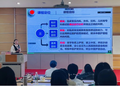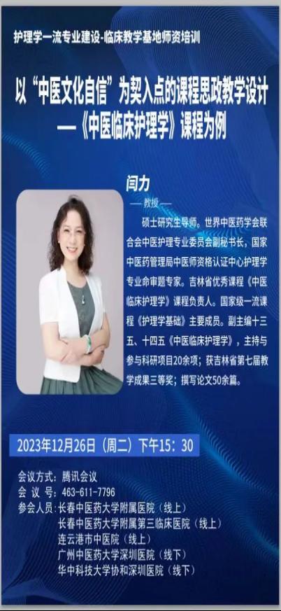 闫力教授讲座以题为以“中医文化自信”为契入点的课程思政教学设计—《中医临床护理学》课程为例,具体阐述了中医临床核心课程的教学设计与实施、中医护理教育的目标和实施策略方法、中医临床护理学课程内容与教学方法、中医护理教育的使命与担当、中医护理学课程改革与文化自信、教学管理策略与小组学习实践、中医护理专业课程的教学与评估、强调了课程目标是培养学生对中医文化的信心、护理专业信念以及对患者使命担当的意识。