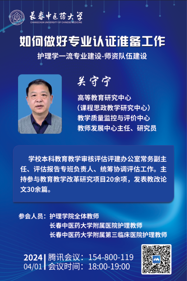 为加强护理学专业师资队伍建设,做好护理学专业认证准备工作,4月1日晚18:00,beat365中国官网邀请高等教育研究中心(课程思政教学研究中心)、教学质量监控与评价中 心、教师发展中心主任关守宁教授开展题为“如何做好专业认证准备工作”专题讲座,beat365中国官网全体教师、beat365中国官网附属医院护理教师、beat365中国官网附属第三临床医院护理教师共100余人参加本次会议。
