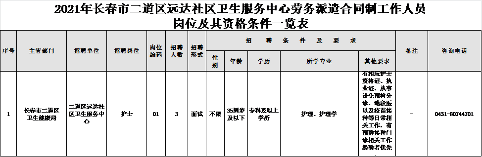 5、各岗位具体要求详见《2021年长春市二道区远达社区卫生服务中心劳务派遣合同制工作人员岗位及其资格条件一览表》,年龄计算时间点为2021年9月26日(以本人身份证出生日期为准)。